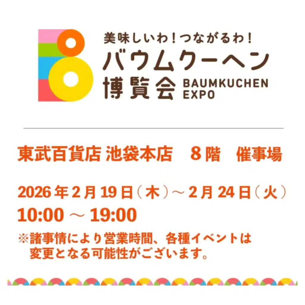 今年もバウムクーヘン好きにはたまらないあのイベント、「バウムクーヘン博覧会2026」の季節がやってきました! 当店も東武百貨店 池袋本店の会場にて出店いたします。