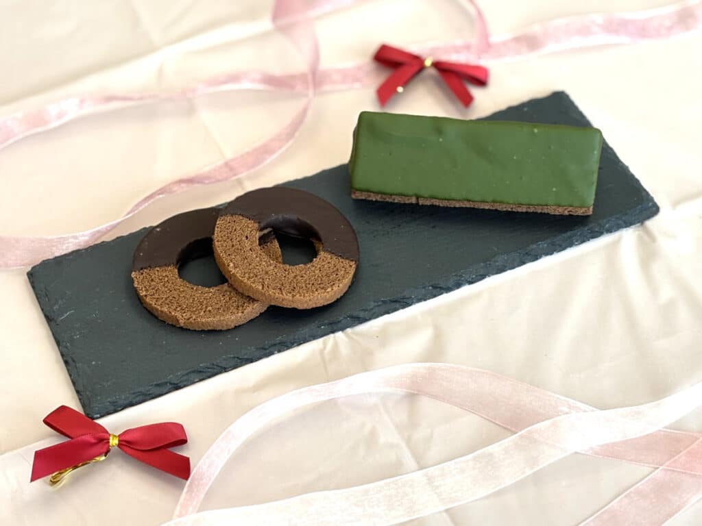 - 抹茶チョコバウム:濃厚なチョコバウムを、香り高い抹茶チョコで半分をコーティングしました。